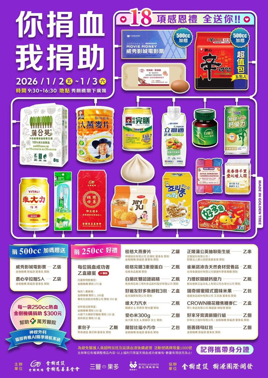即日起,於台东捐血站捐250cc送2026手册,500cc送2026手册或桌历任二本(送完为止)