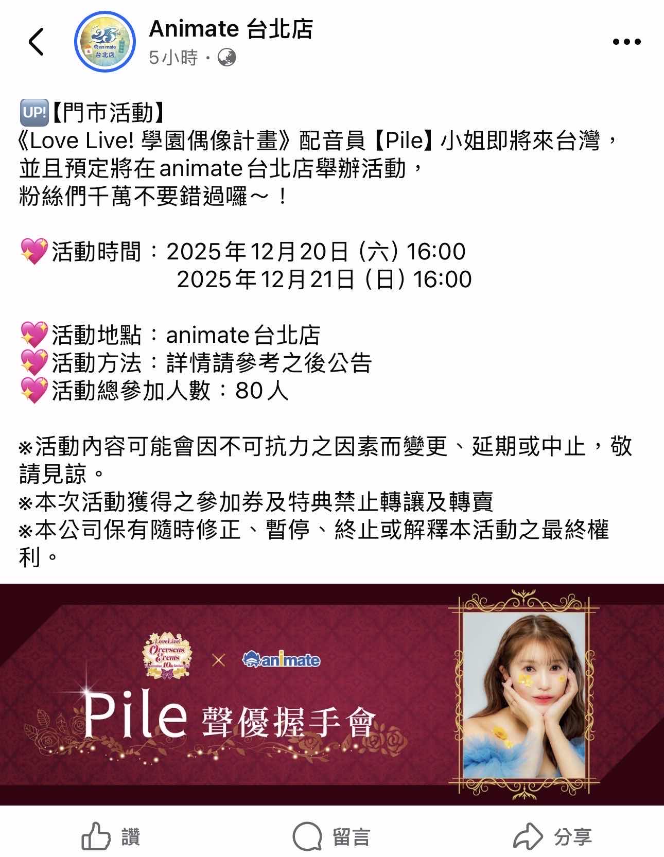 《Love Live! 学园偶像计画》配音员【Pile】小姐即将来台湾,