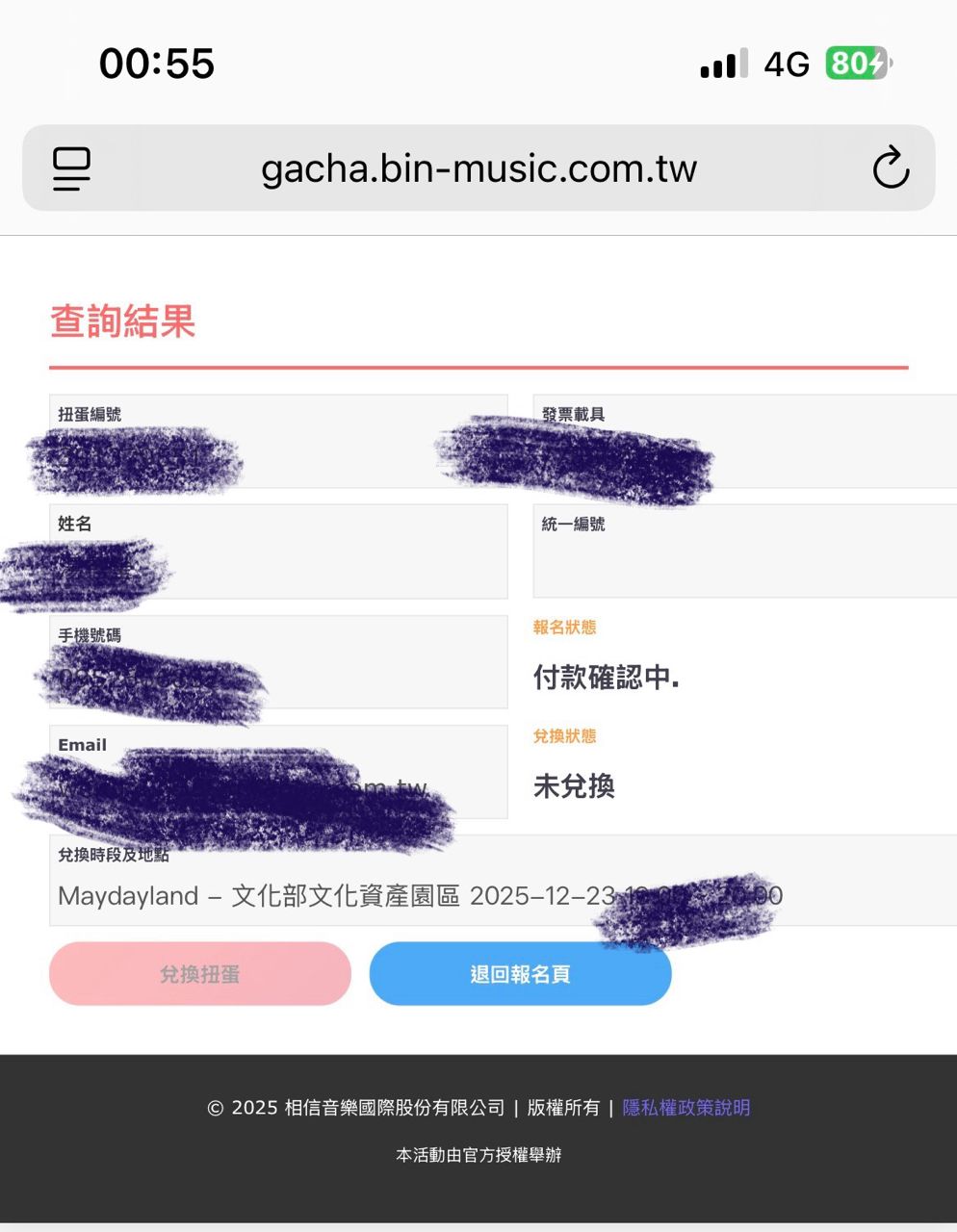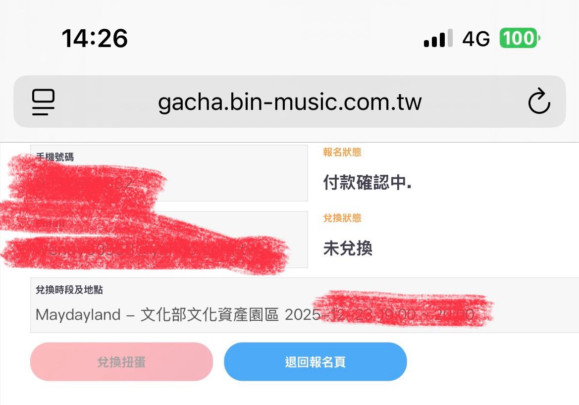 扭蛋活动开始时兑换功能将开启,排队入场前需出示报名结果查询页面,於扭蛋前由工作人员协助引导核销(截图无法使用)。