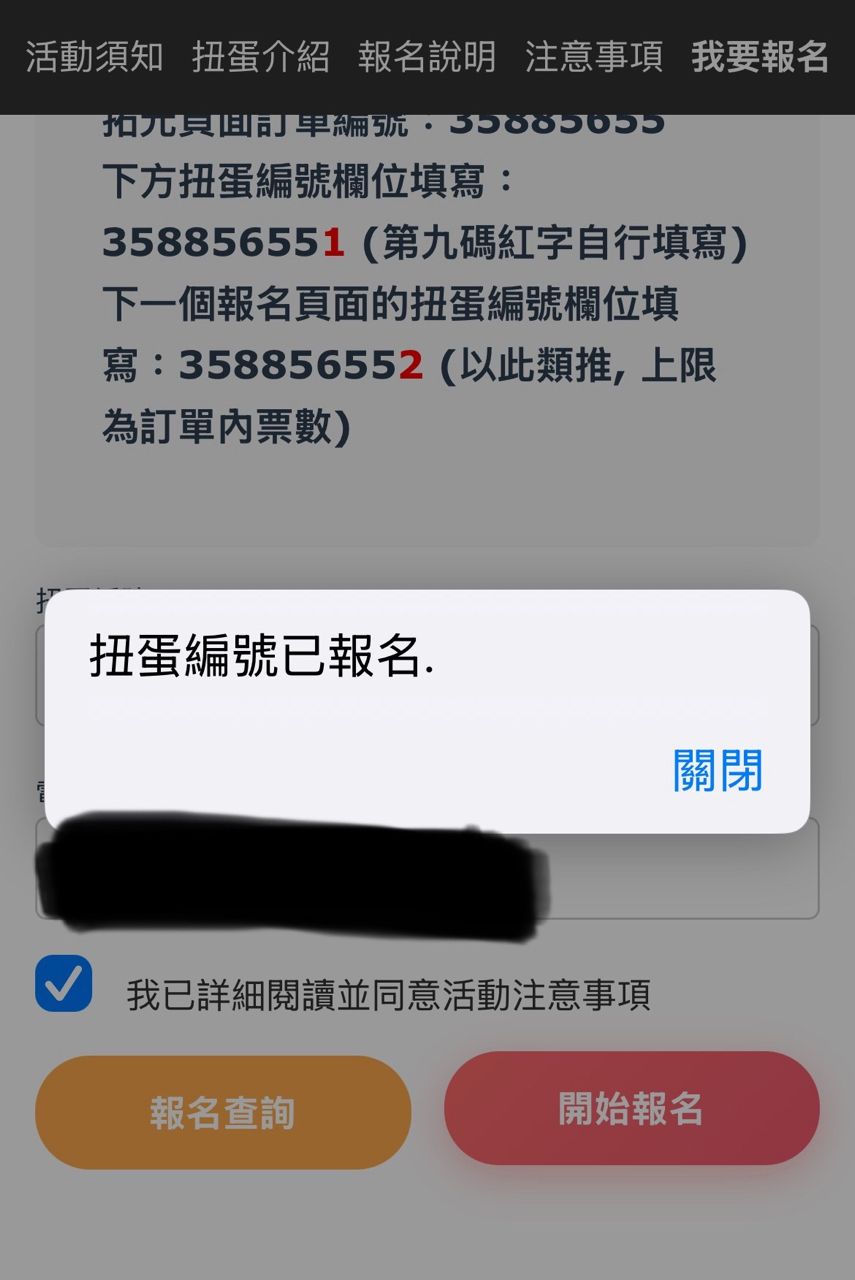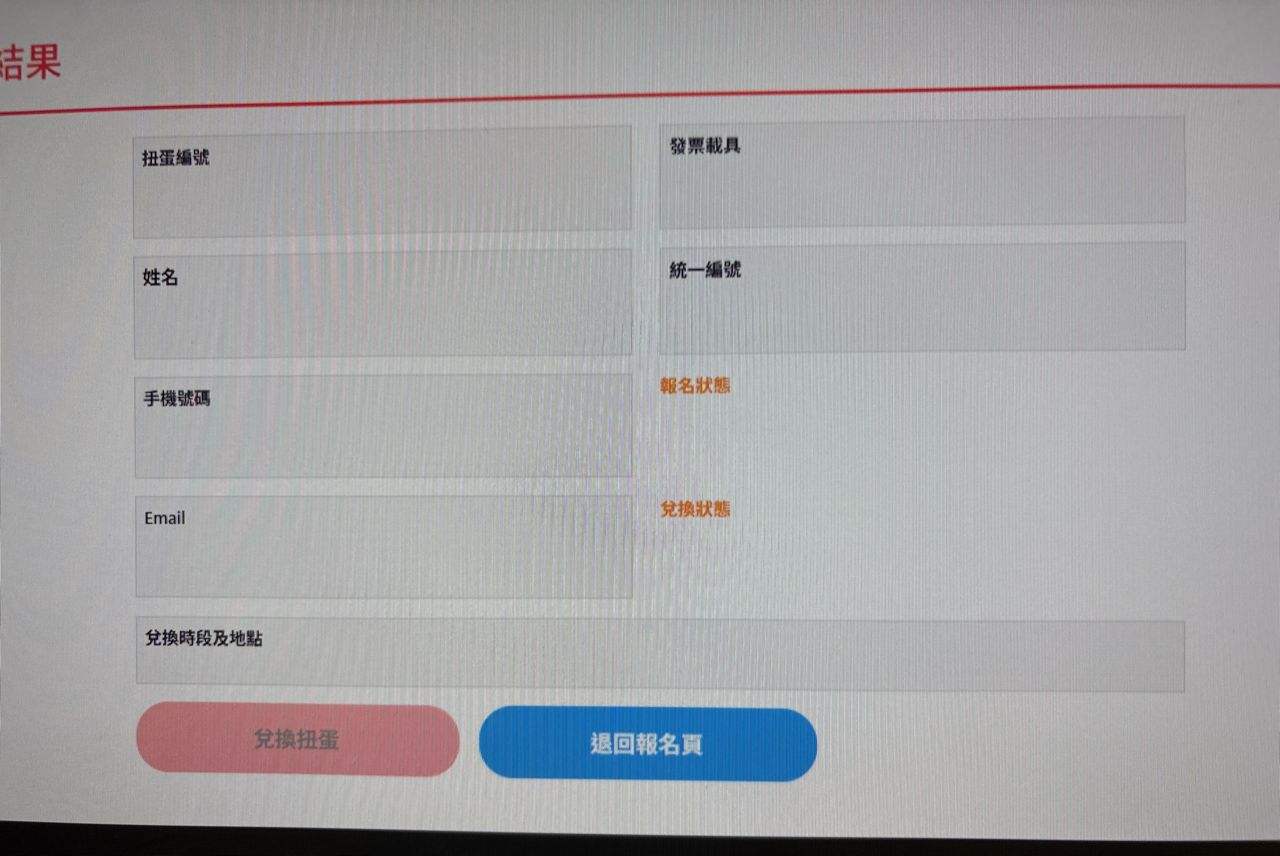 至扭蛋报名页面输入「扭蛋编号」及「电子信箱」後,点击「开始报名」并填写报名资讯(姓名、手机号码、联络用之电子信箱)。