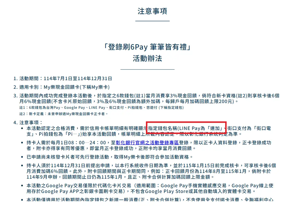 (二) 本活动认定之合格消费,需於信用卡帐单明细有明确显示指定钱包名称(LINE Pay为「连加、连支」、街口支付为「街口电支」、Pi拍钱包为「Pi—」)始享本活动回馈,帐单明细上所载内容认定,限以彰化银行系统判定为准。