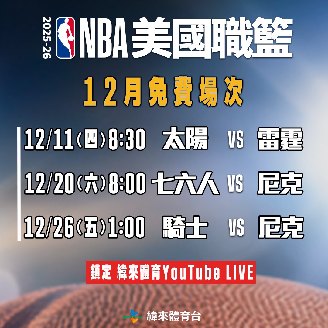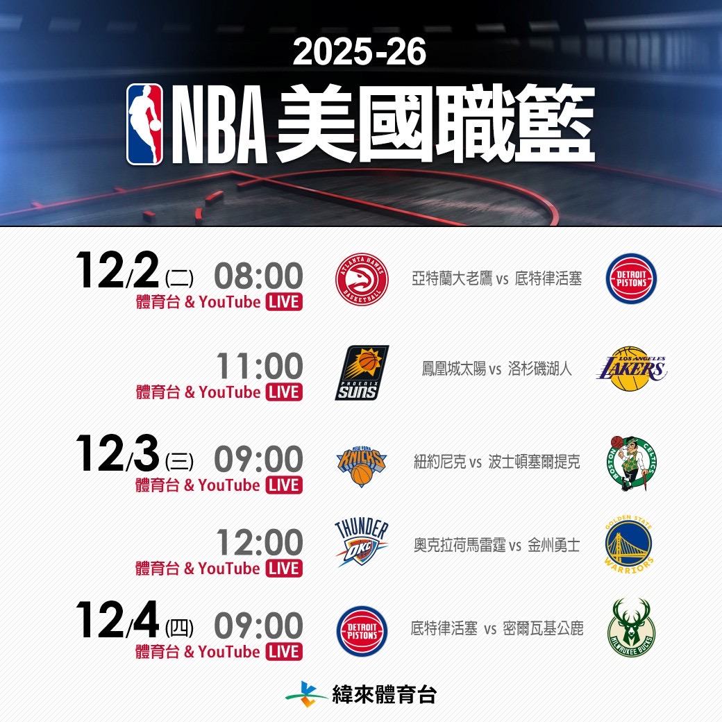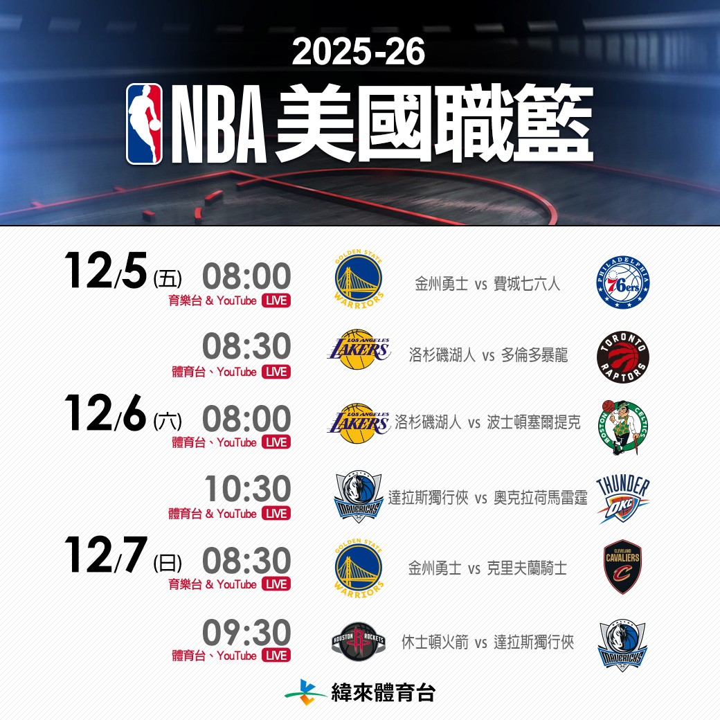 │ 2025-26 例行赛 (台湾时间) ESPN NBC Peacock Amazon Taiwan 纬来 │