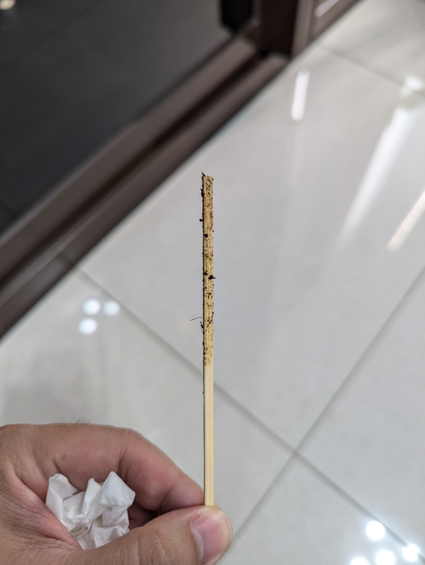 二是用细竹签插入盆土内再抽出,刚才实验如下图,第一张是用别盆确定还是湿的观叶介