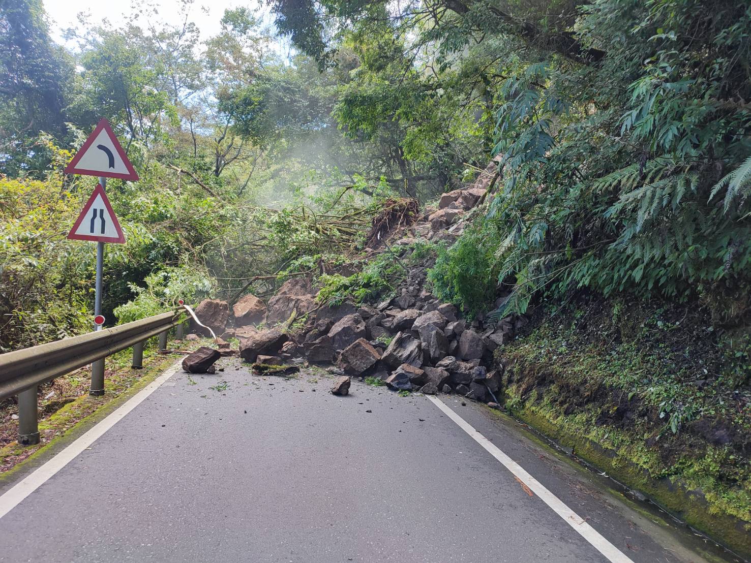 台14线18.7K翠峰路段今发生坍方,落石阻断道路,目前从埔里上合欢山的交通中断。图
