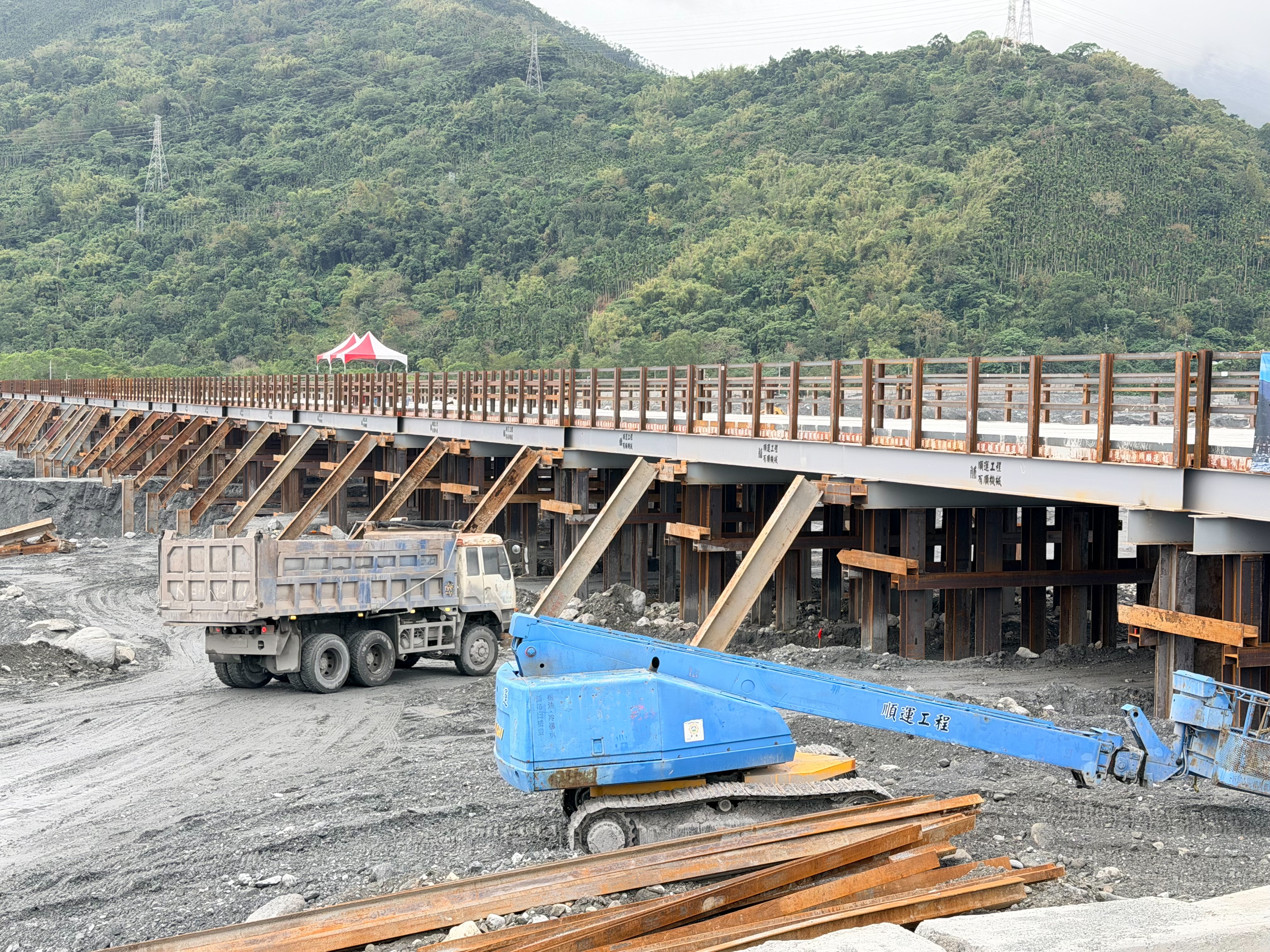 台9线马太鞍溪桥遭堰塞湖洪灾冲断後,交通部公路局加速兴建钢构便桥,原订明年1月底