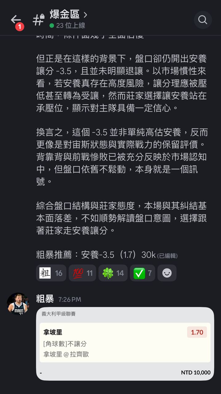 285F:→ rayes: 这场开盘很精准 角球进球都卡 101.12.100.112 01/04 21:25