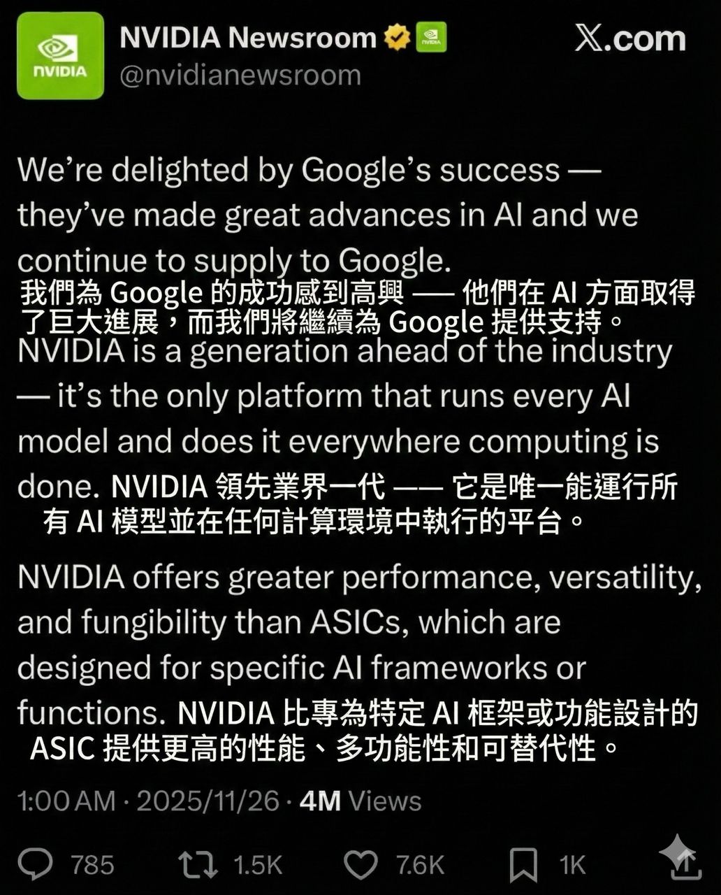 47F:推 xcompaqx : 超爽 不管是辉达还是谷歌 gg都是赢家 11/26 08:34