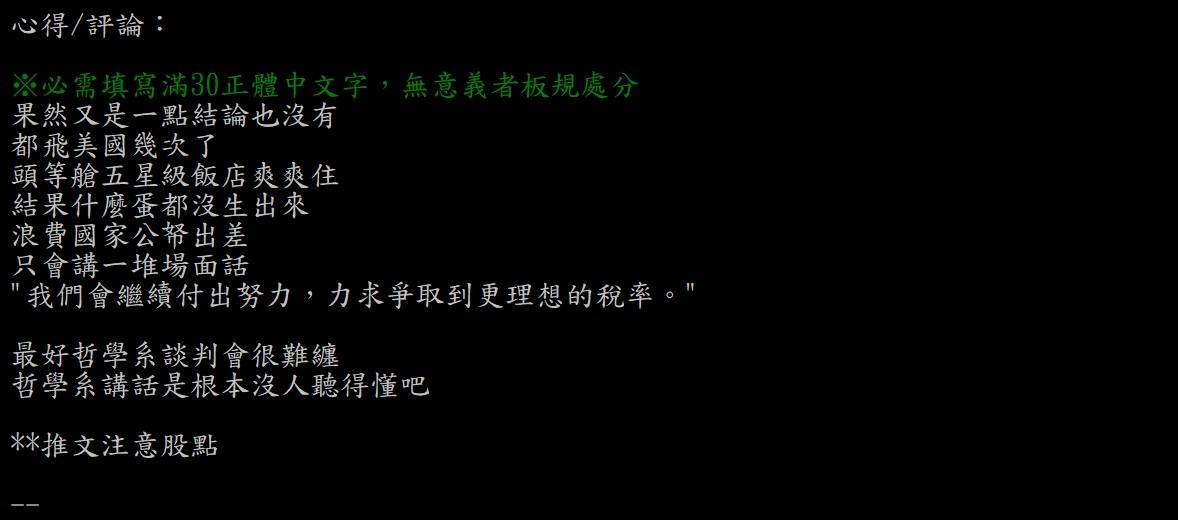 : → jerrychuang: 我同意我是报怨"关税谈判进度",所以报怨关税进度要 08/16 10:51