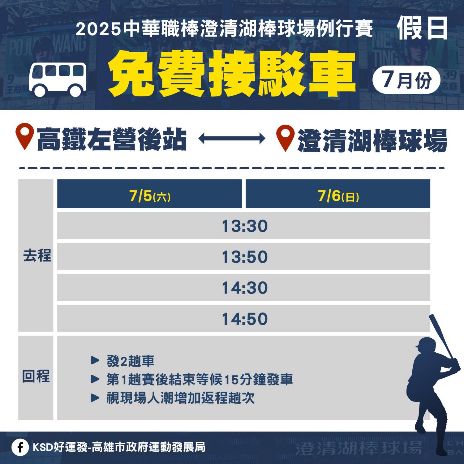 ❷ 左营高铁站→澄清湖棒球场:红61(假日停驶)