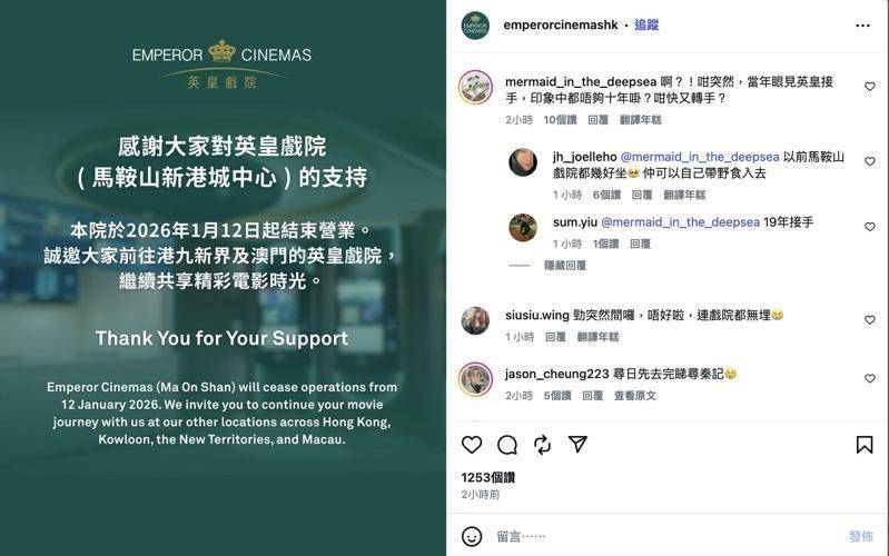 无预警宣布即日起结束营业,成为2026年开年後,香港第一家关闭的影城。不少影迷留言