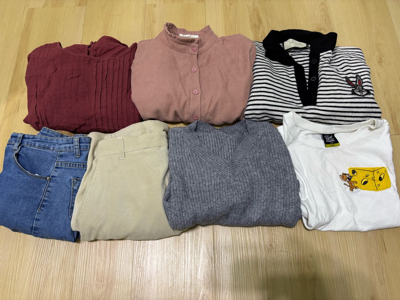 备注:上排洋装*3、下排长裤*1、长裙*1、短上衣*1、长毛衣*1,可以早上8点前给寄编