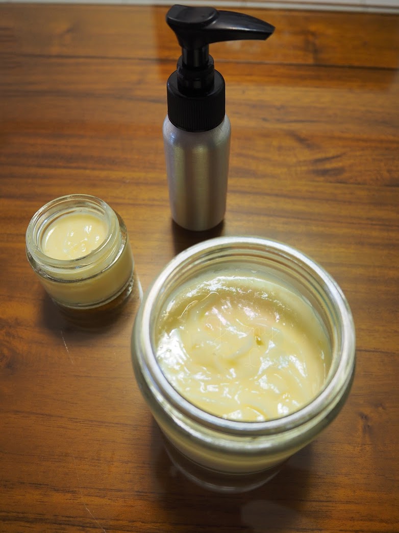 因为我没有电动搅拌器,只能以手动打....打完绝对会想手刀买一个电动搅拌器,这次制作找了男友一起,两人轮流打到手酸还是没有乳化的感觉,速度超慢,不知道是蜂蜡太多还是降温到温度太低,最後还剩下一点水没用完就算了,成品很香~几乎都是椰子油味,我精油加很少盖不过他的味道,擦完简直就是一个行动奶酥面包,加橙花纯露是因为当初买了1000m的,准备跟老妈每碗一人一杯对饮,但老妈不领情,不知道何年何月方能用完,这次就豪迈的加下去了~