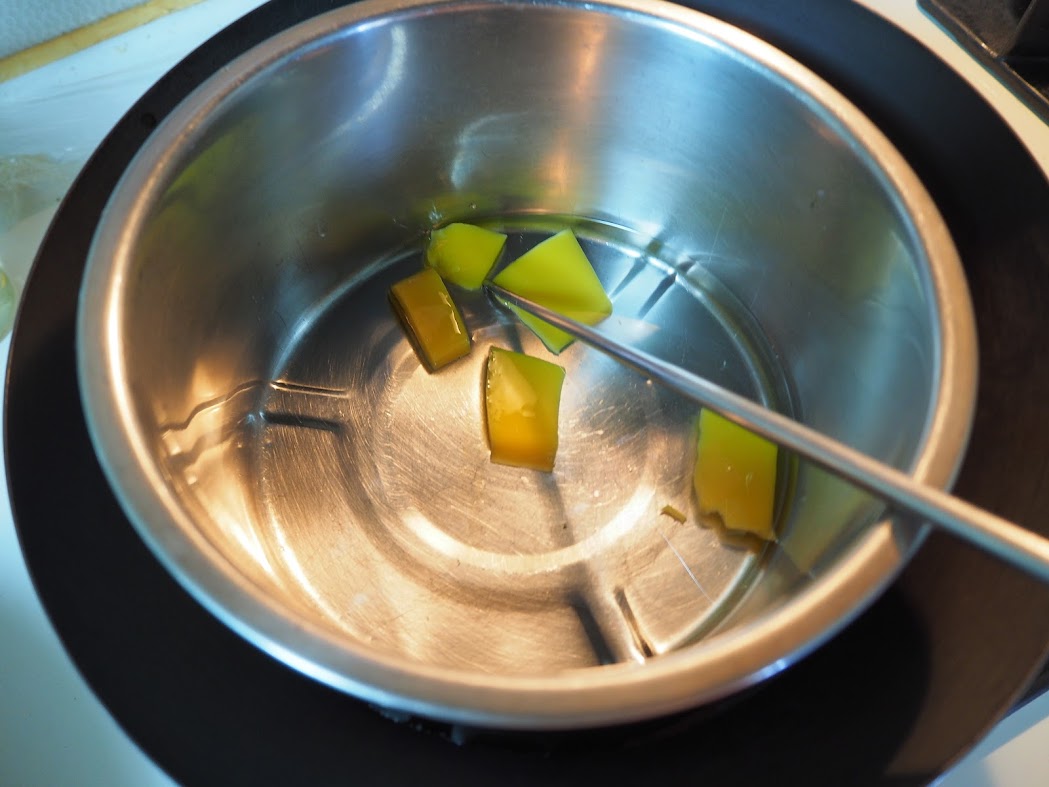 1. 椰子油+蜂蜡在容器内隔水加热,直到蜂蜡融化後离锅