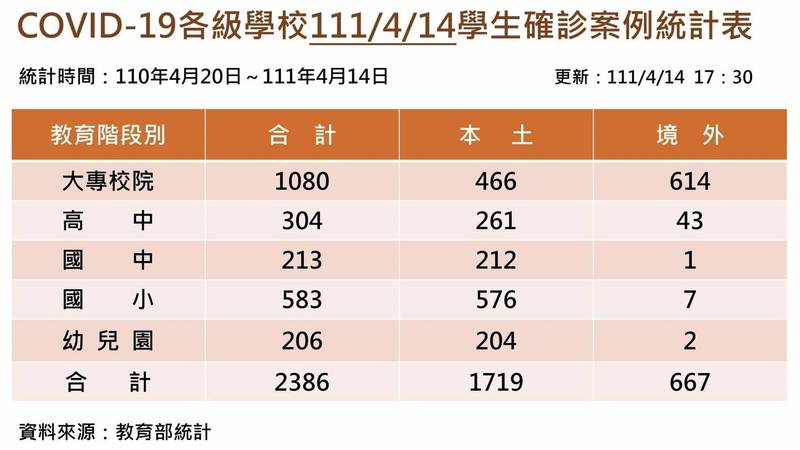 教育部校安中心統計4月20日至今日下午5時30分我國學生確診人數,在總數2386人之中,