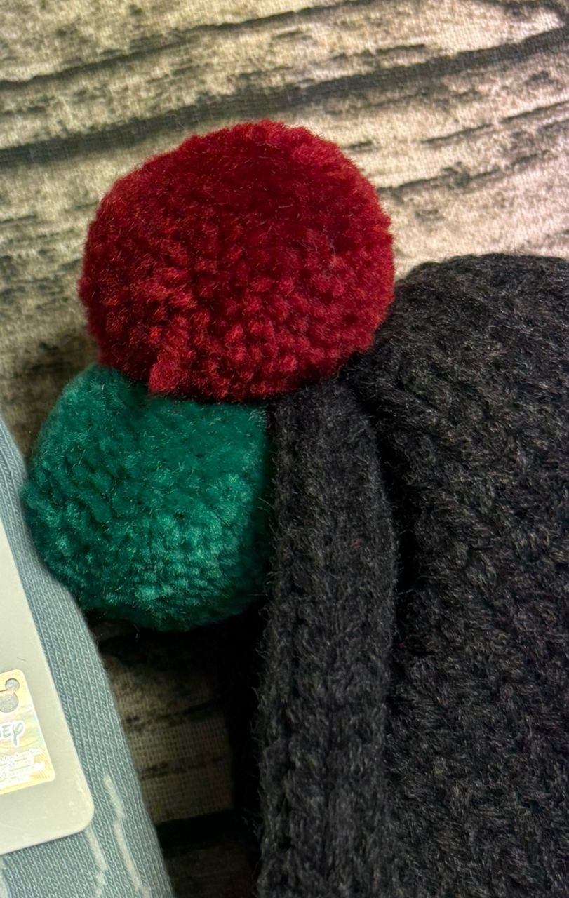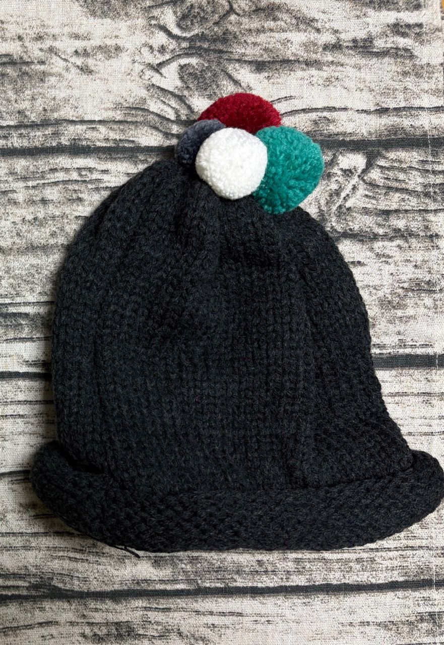 無品牌黑色針織球球毛帽:全新未戴過,大約適合3-6歲,內裡有一處勾線、頭頂紅球上