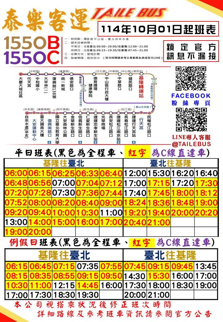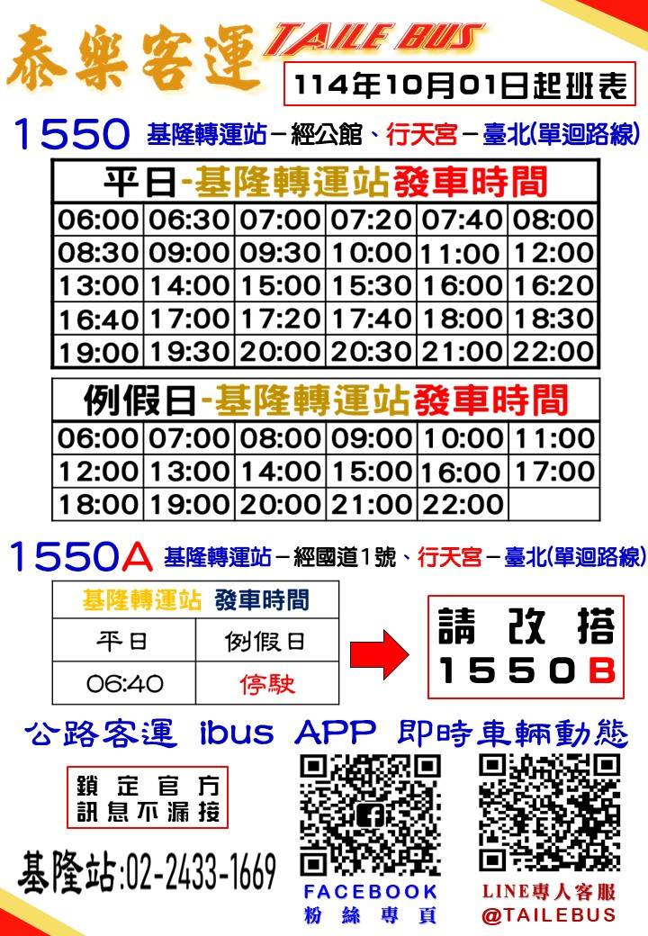 1550A 平常日 維持單迴1車次,基隆轉運站 06:50 班次調整為 06:40 發車