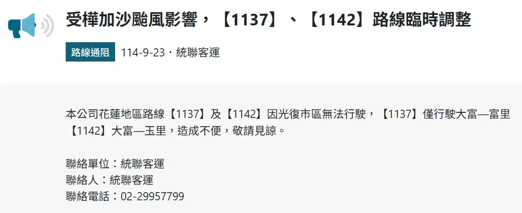 標題[情報] 250923 統聯 1137/1142 短期縮駛