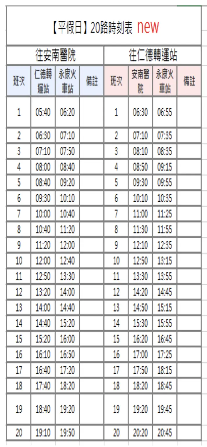 營運路線 大台南公車 20 仁德轉運站-安南醫院
