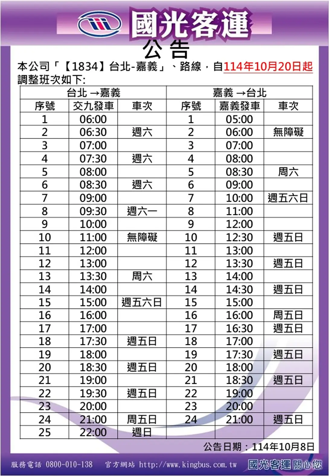 營運路線 國道客運 1834 臺北-嘉義