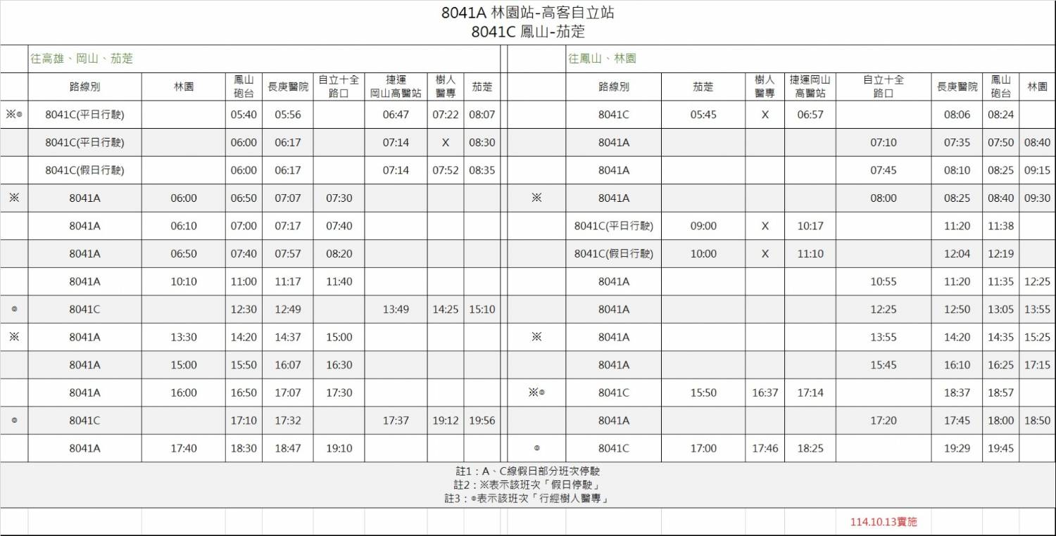 8041C 平常日 鳳山砲台 05:40 班次調整為 05:30 發車並繞駛樹人醫專