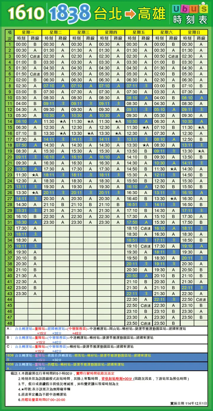 18 00 1610A 楠梓 岡山 中港 經國 重陽 臺北 1234567