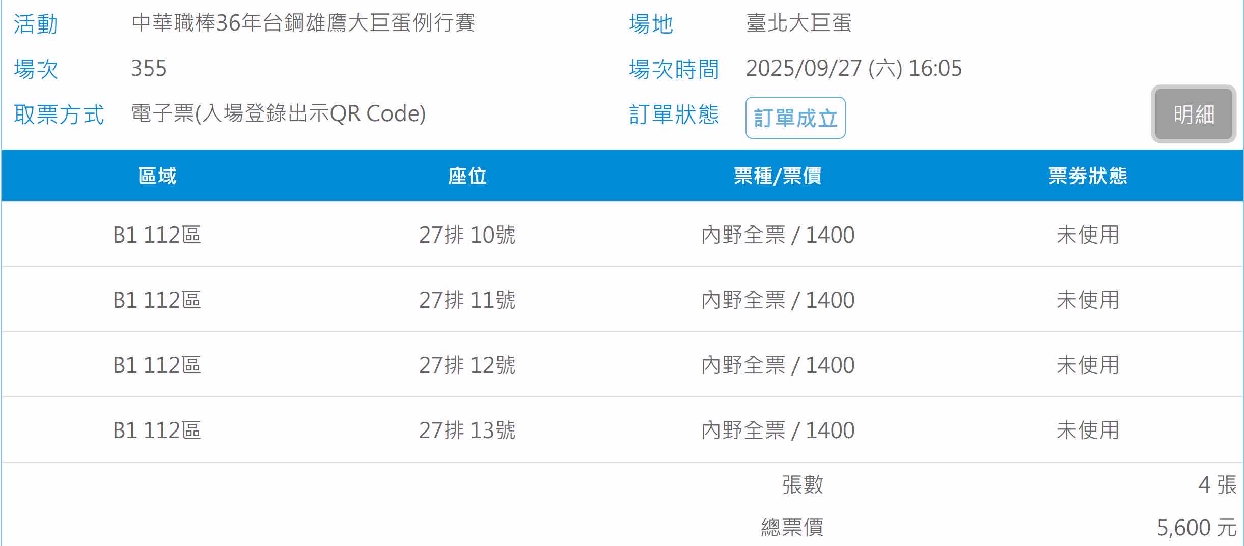 標題[賣票] 9/27 統一vs台鋼 B1 112區 4連號