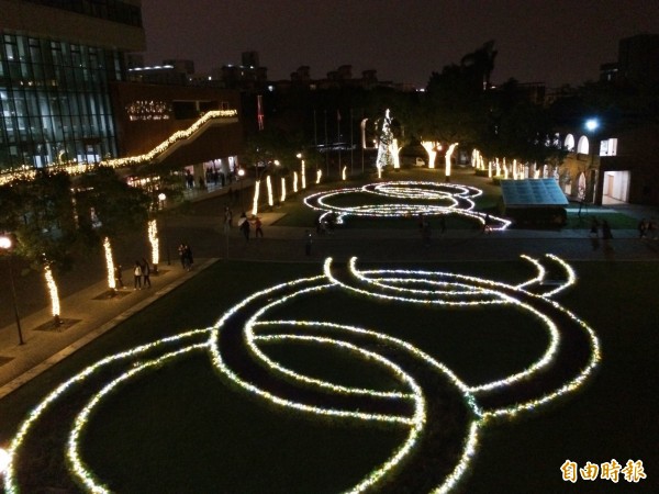 中原大學很有耶誕fu!10萬顆LED燈飾照亮校園。(記者李容萍攝)