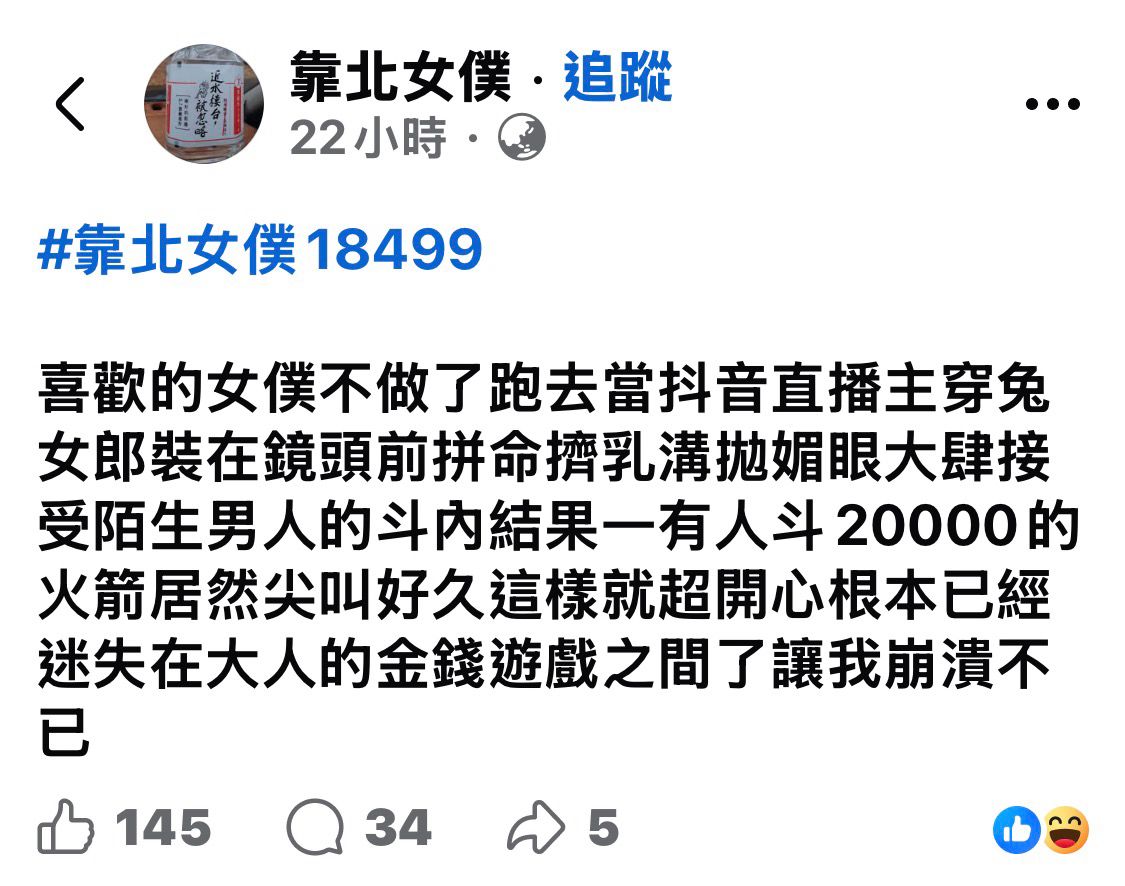 35F:推 NekoArcueid: 下一個是靠北抖音嗎?喜歡的直播主被包養20萬,#$%^& 02/19 15:25