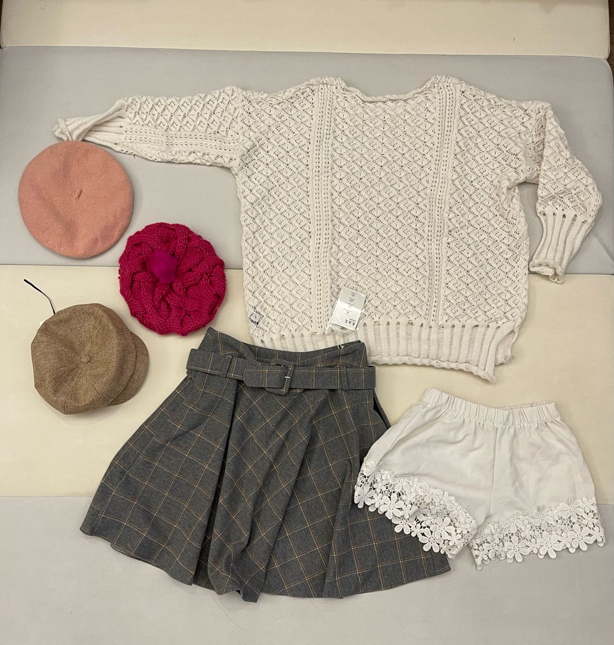 一件毛衣、一件裙子、三頂帽子、一件安全褲