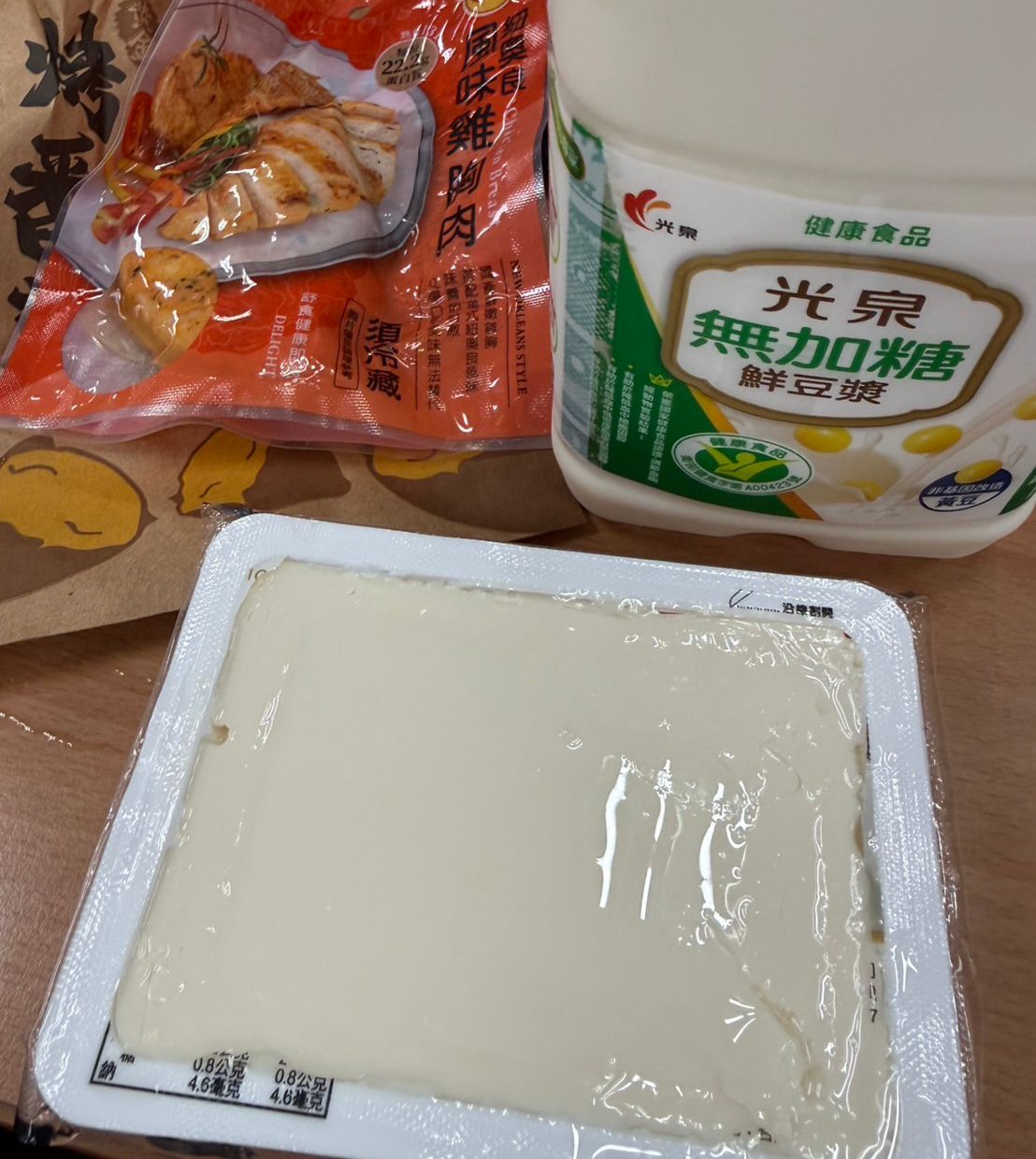 好市多的大漢豆腐一盒+超商的卜蜂雞胸肉(紐奧良口味,這個口味最好吃)+無糖豆漿450cc