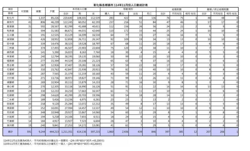 彰化縣最新人口統計,到今年11月30日止,總人口數121萬多人,去年同期還有122萬多人