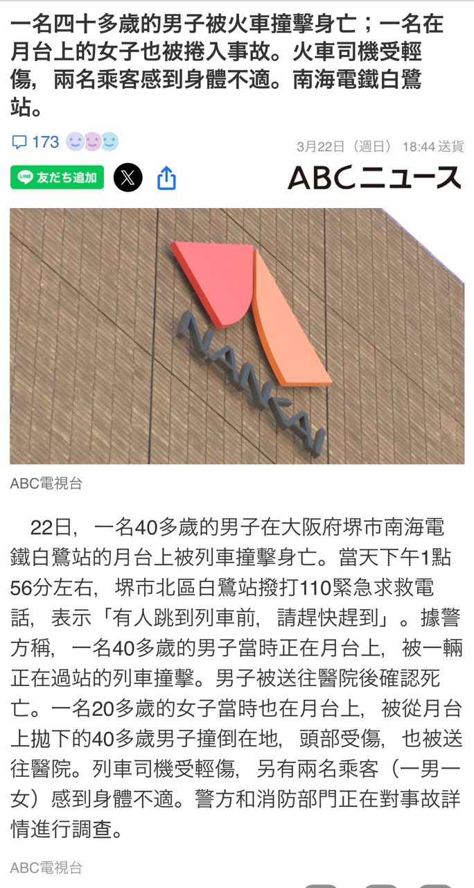 標題[問卦] 日男跳軌 屍身撞飛女子 南海電鐵一時停