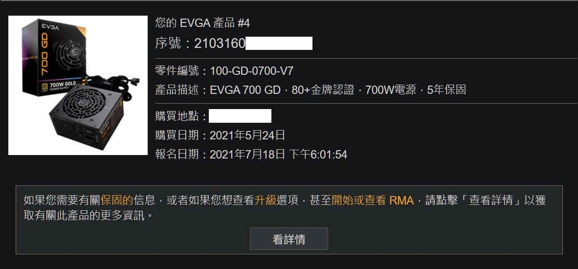 ◎硬體型號: EVGA 700GD 700w金牌 PSU