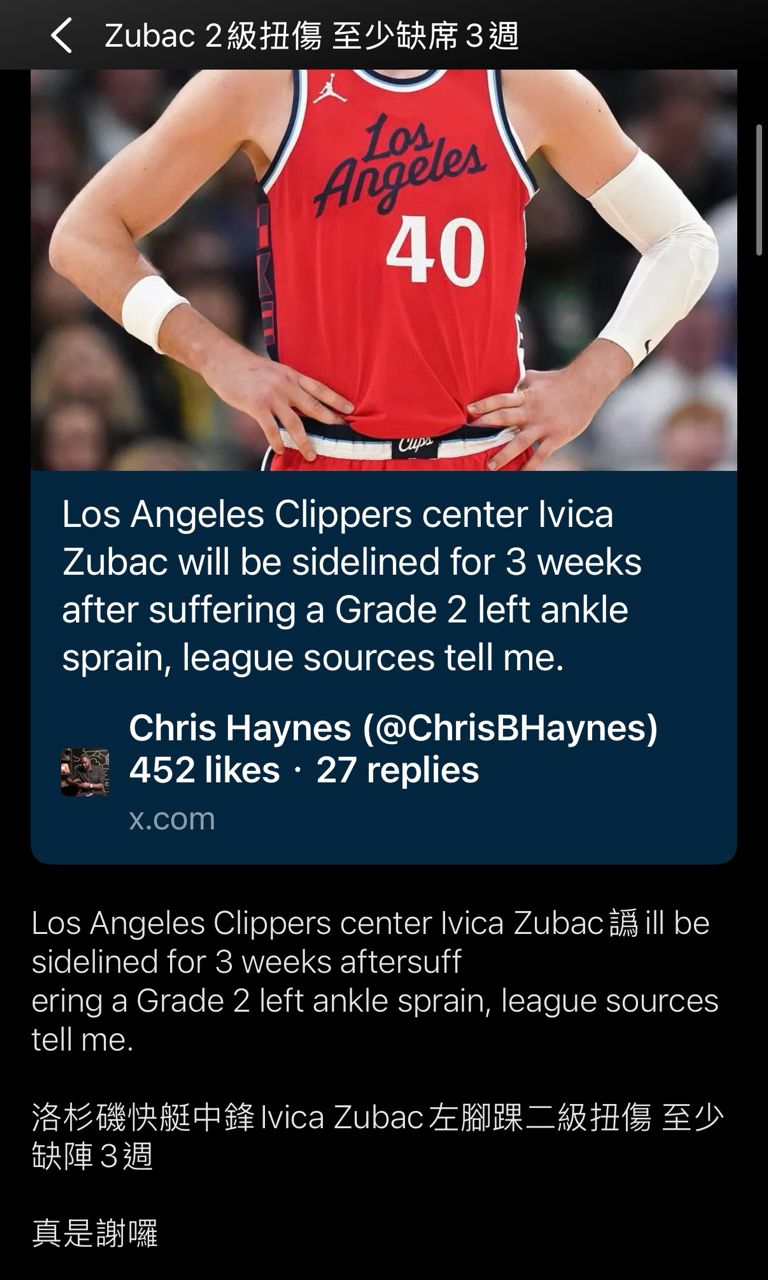 標題[情報] Ivica Zubac腳踝二級扭傷