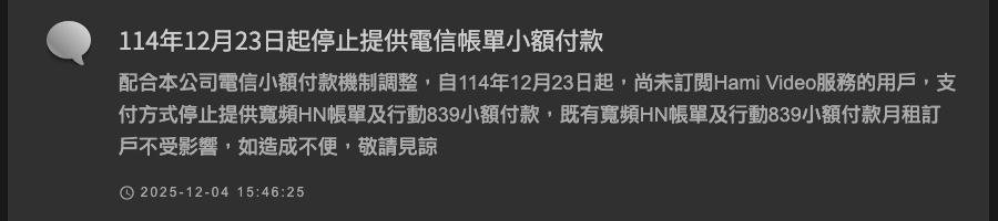 標題[其他] Hami Video 停止提供市話/電信帳單付款