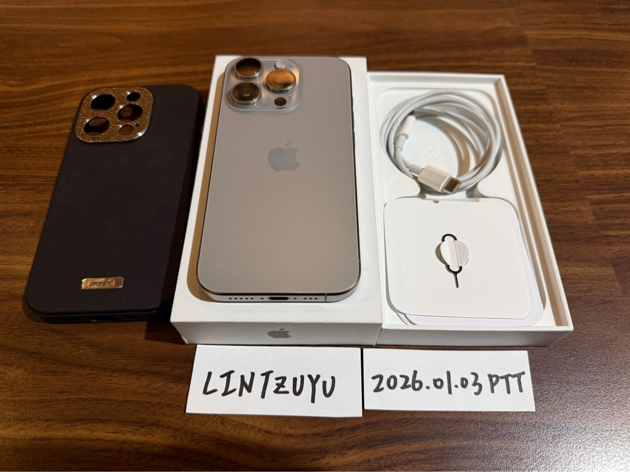 原廠盒裝、充電線、卡針、moshi手機殼