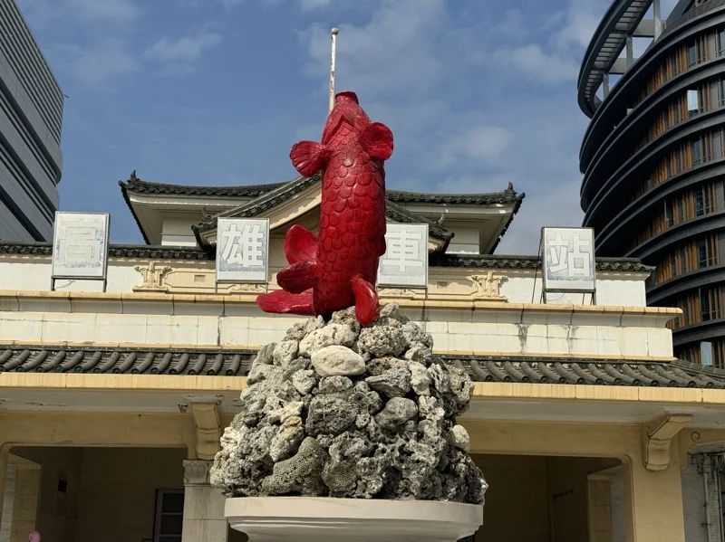 陪伴高雄走過數十年的帝冠車站地標紅鯉魚,配合鐵路地下化工程藏身多年,隨著車站完