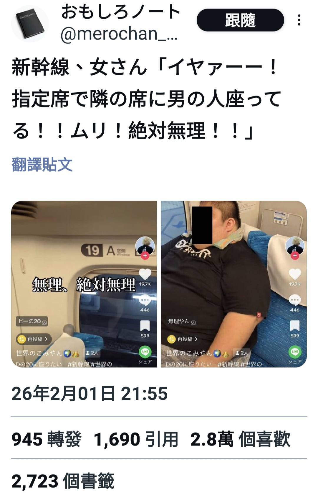 標題[閒聊] 搭新幹線女性抱怨鄰座男性