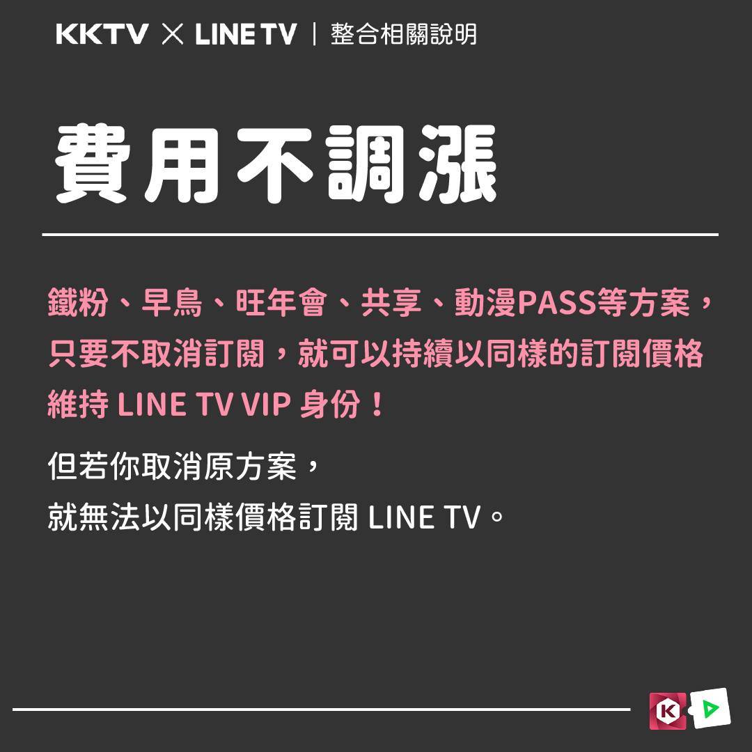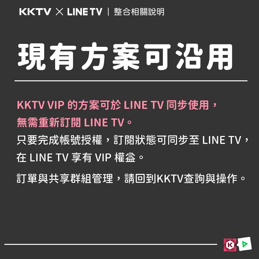 號,並在LINE TV 享有VIP身份。KKTV 會員的原方案皆可於 LINE TV 沿用,無需重新訂