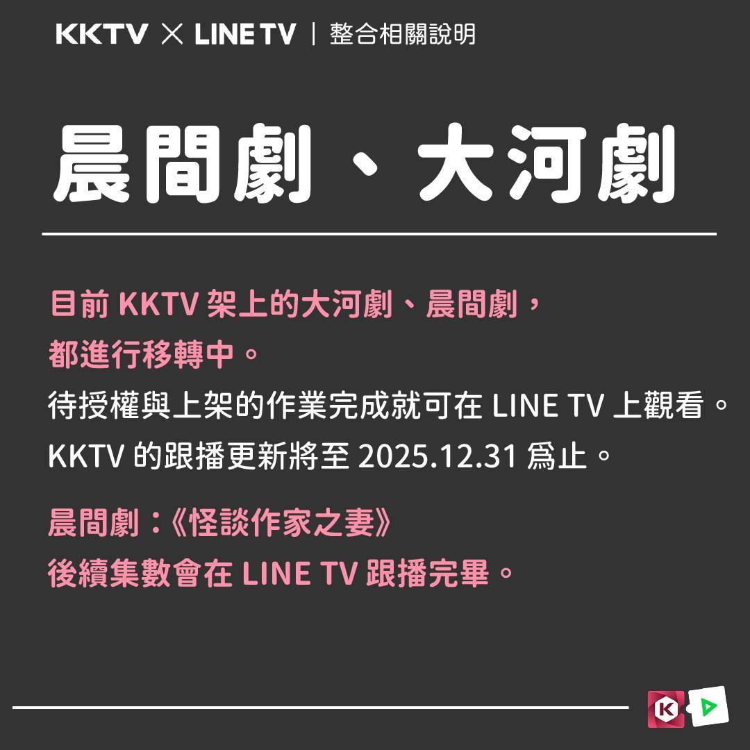 完成移轉上架的作品,從 2025.11.12 起,將在 KKTV 作品頁提供「LINE TV 已上架提
