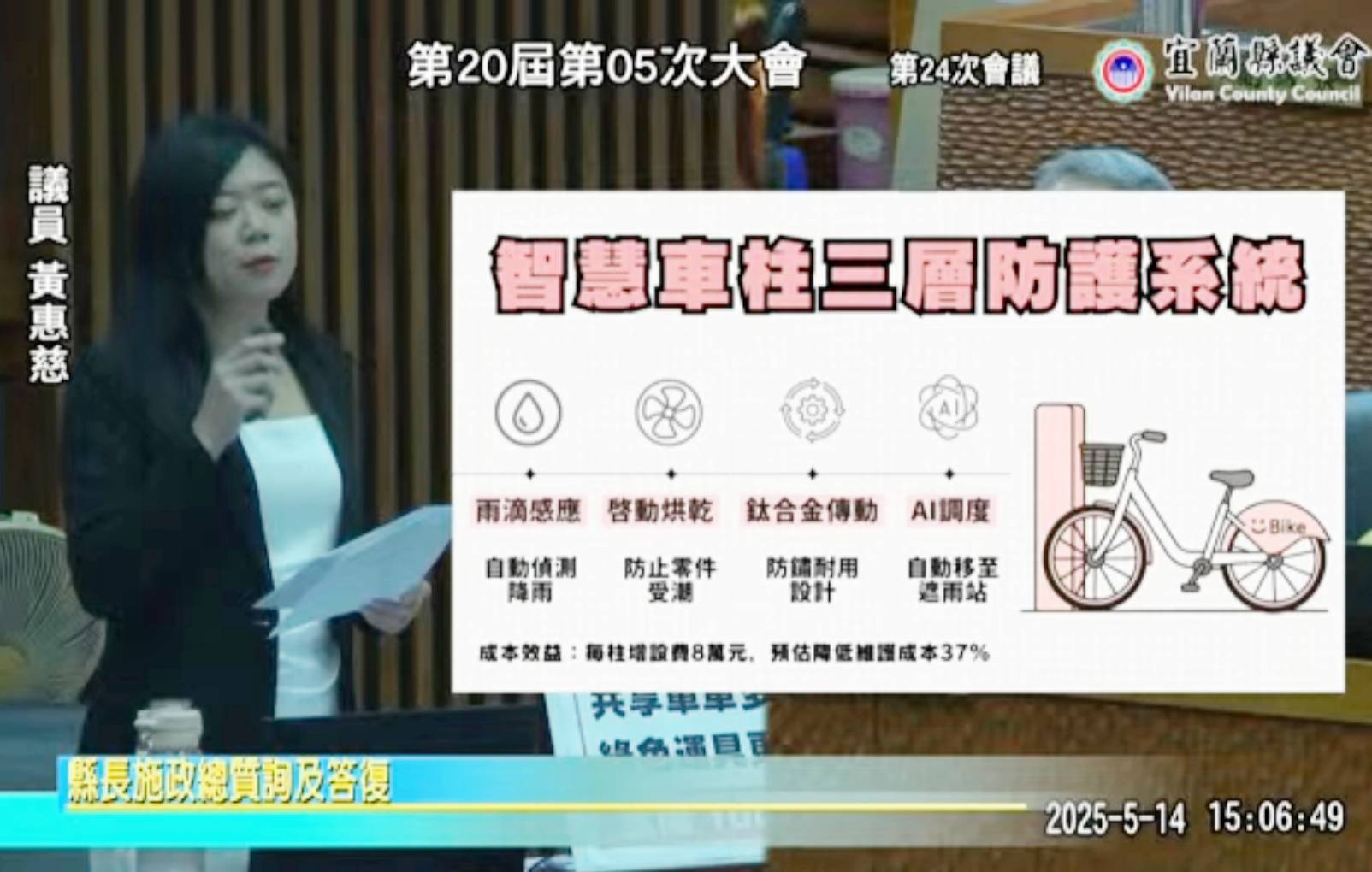 宜蘭縣政府認為宜蘭多雨,不適合推動YouBike,但縣議員黃惠慈拿出各項比對數字,要