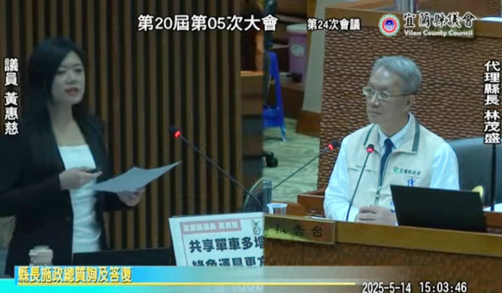 黃惠慈議員提出3訴求,請縣府成立「公共自行車推動小組」,今年底前完成宜蘭市30站