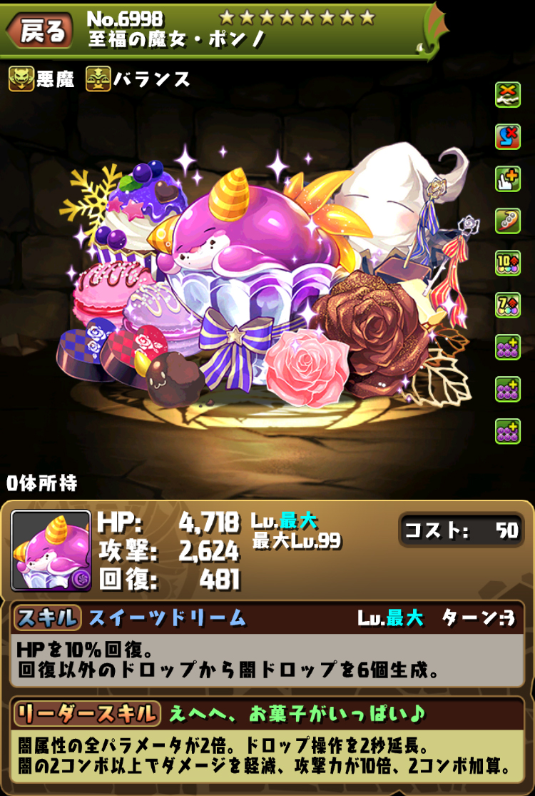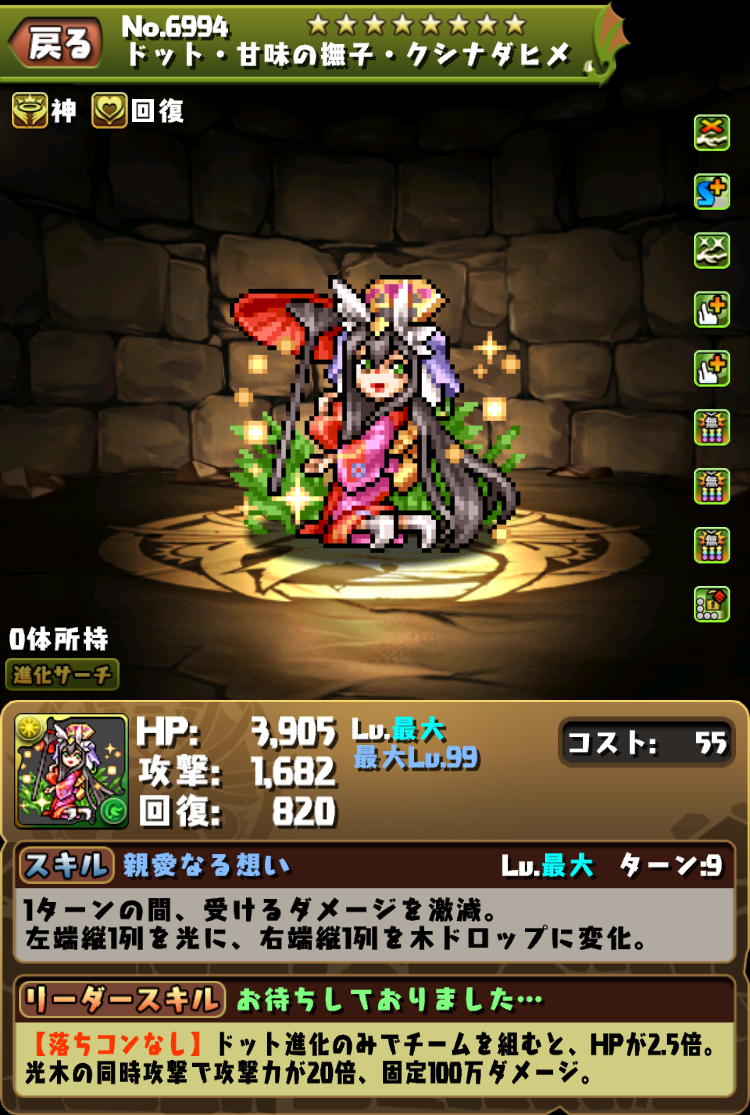 隊長:轉珠固定10秒,龍TYPE攻血回1.6倍、4色以上攻擊時傷害半減/攻10倍/+3C