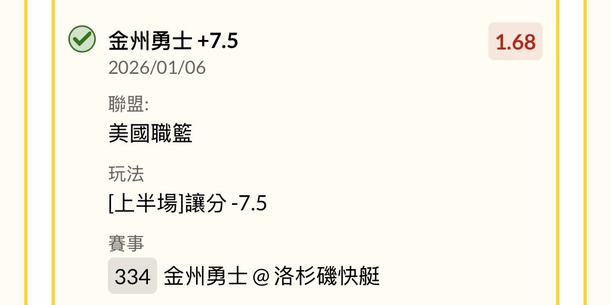 870F:推 john183: 爽啦 勇士+7.5/8.5收 111.83.81.43 01/06 13:36