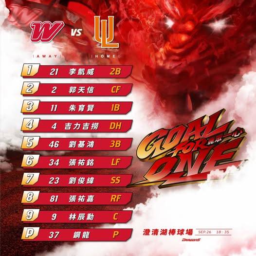 味全龍今日再戰統一獅,洋投鋼龍擔任先發投手,搭配捕手林辰勳,李凱威擔任開路先鋒