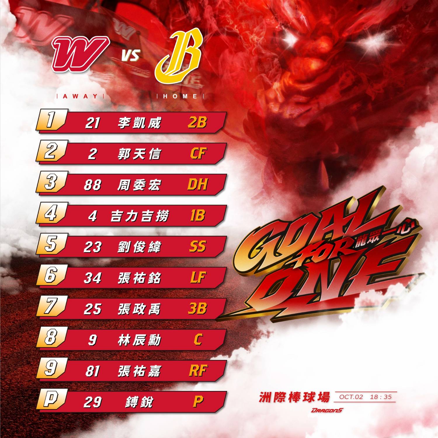 10/02(四) 18:35 味全龍 vs 中信兄弟 洲際棒球場