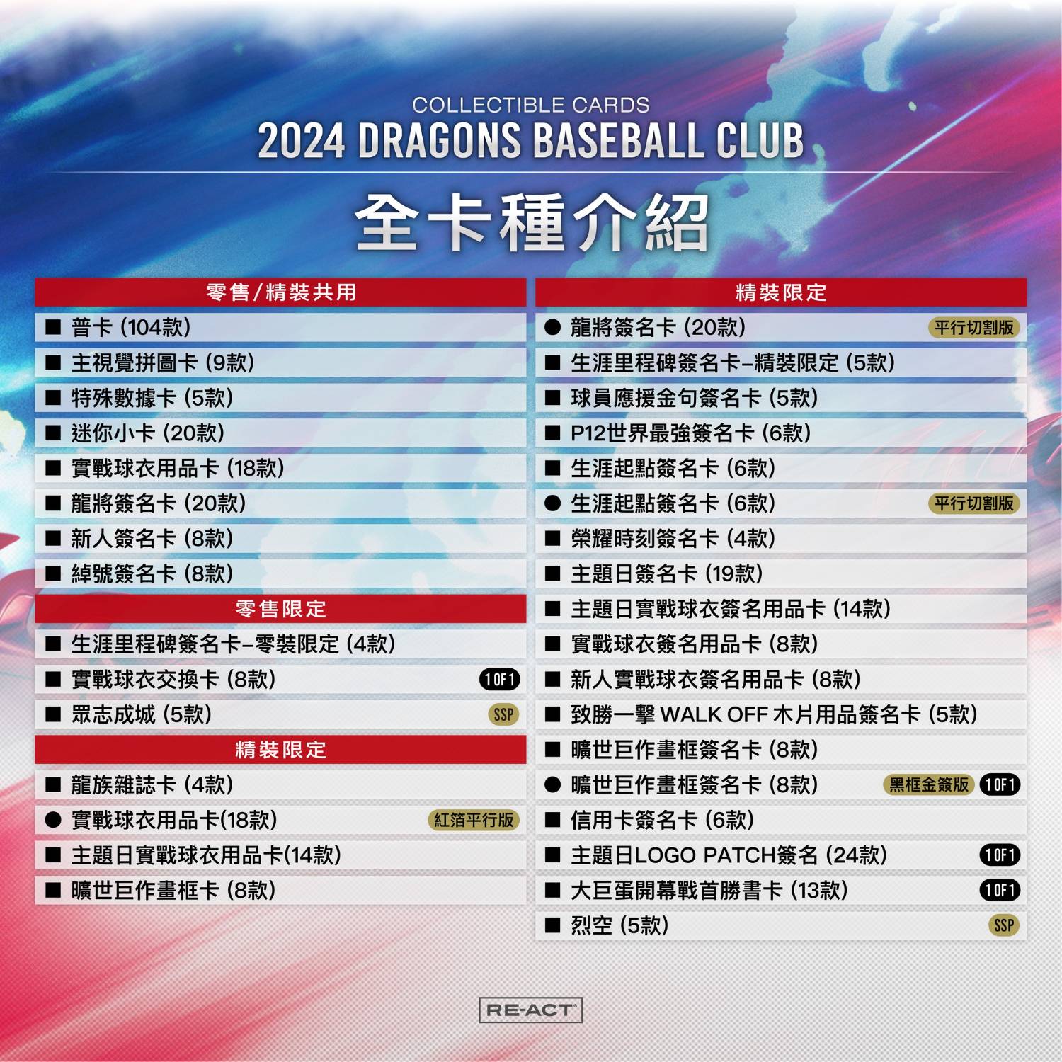 普卡104款、主視覺拼圖9款、特殊數據5款、迷你小卡20款、龍族雜誌4款、實戰球衣用品