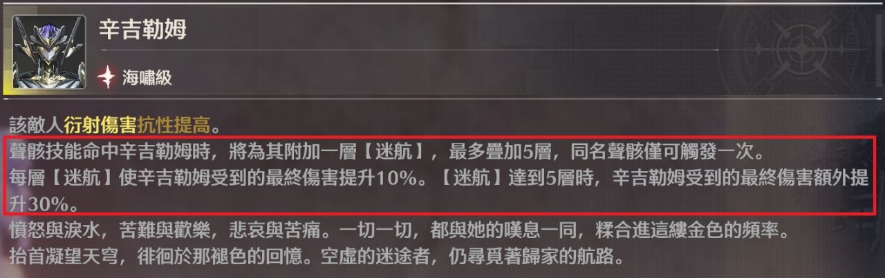 聲骸技能每命中一次辛吉勒姆對其最終傷害提升10%,命中五次額外提升30%