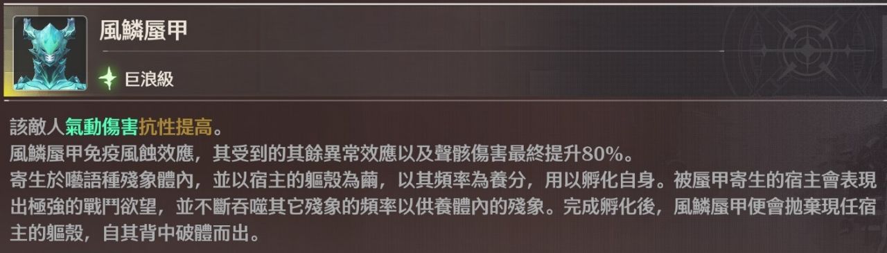 風鱗蜃甲免疫風蝕效應,其受到的其餘異常效應以及聲骸傷害最終提升80%。