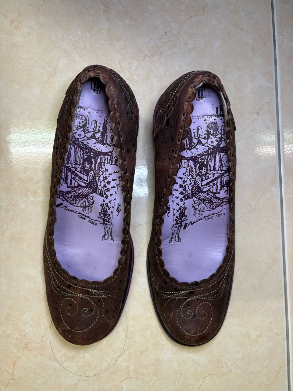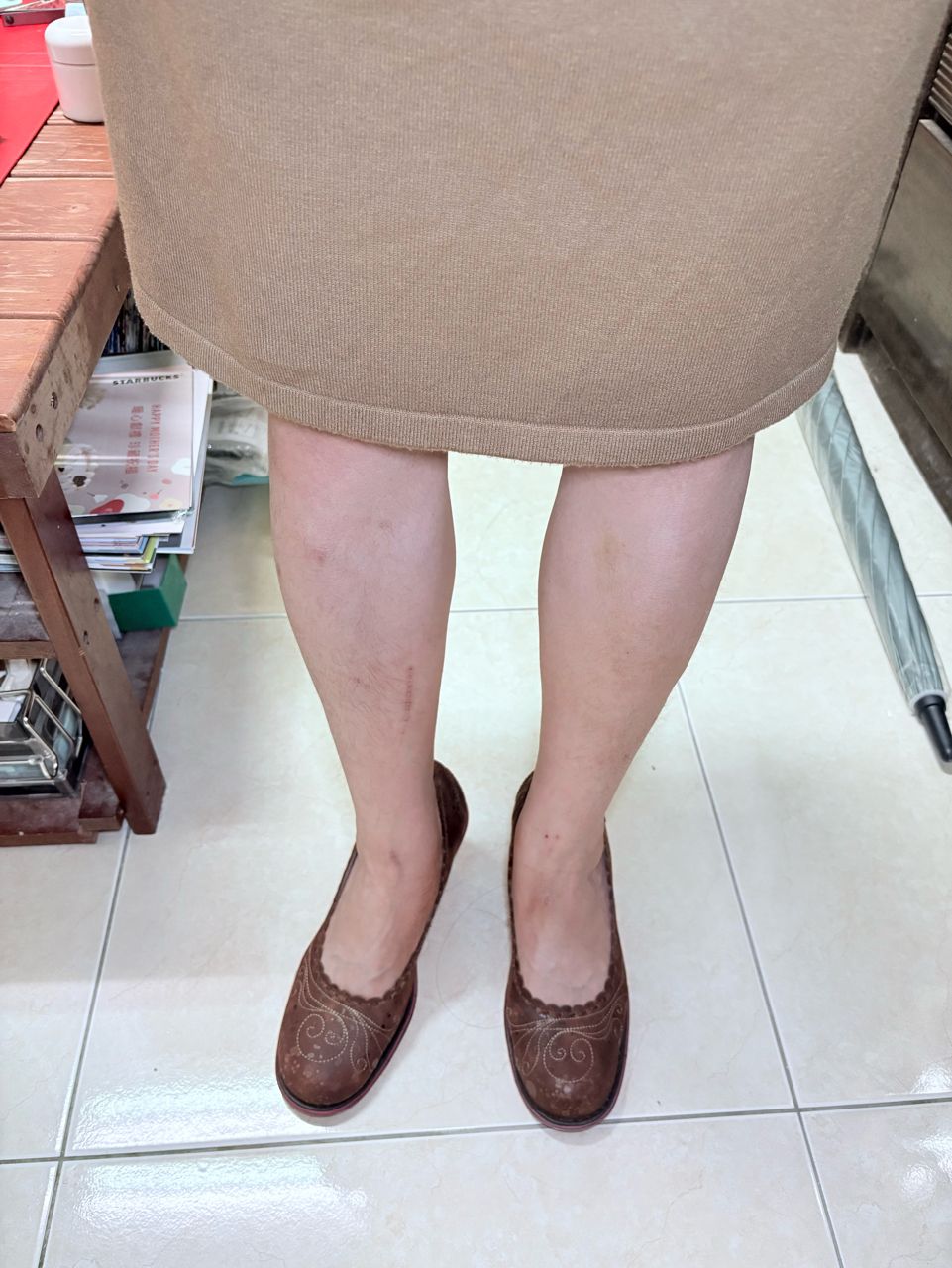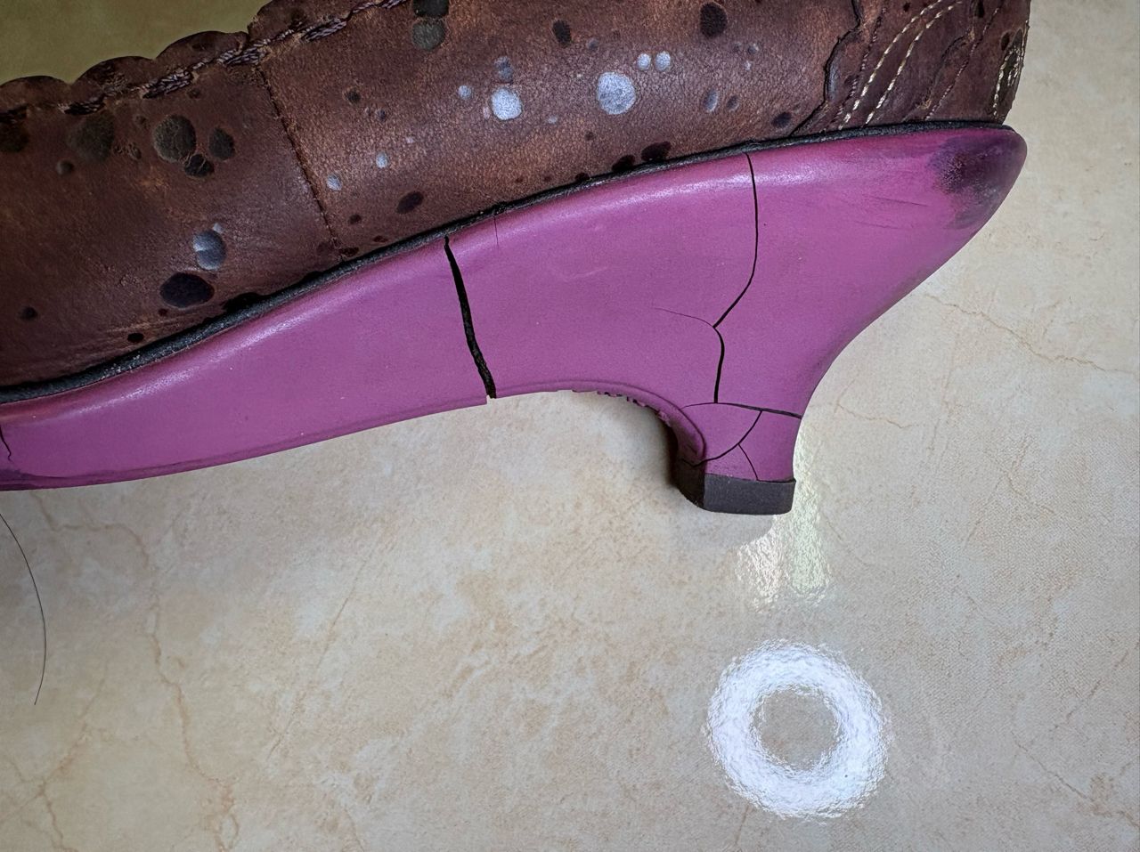 跟鞋外觀完好,穿起來挺舒服,但鞋跟因久放沒穿有嚴重裂痕,我穿著在家裡走過,行走